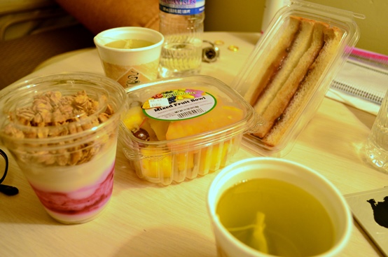 ヨーグルトシリアル、カットフルーツ、ピーナツバタージャムサンドと日本から持ち込んだティーパックのお茶。