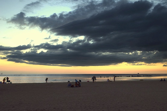 トロリー乗り場のその向こうのアラモアナビーチが、ちょうど夕日の時間帯で、